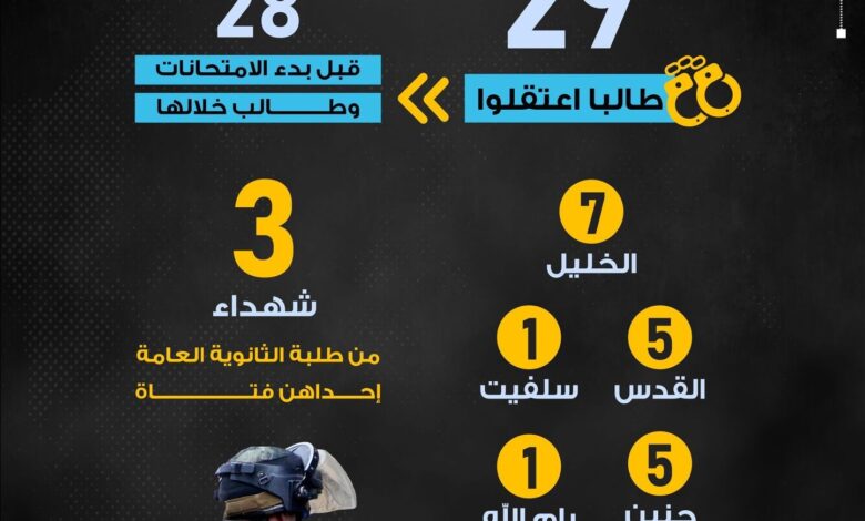 وافاد الناطق باسم وزارة التربية والتعليم صادق الخضور، إن 29 طالبا اسيرا في سجون الاحتلال.
