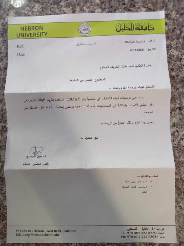 من جانبه، أعلن الناطق باسم الكتلة الإسلامية في الجامعة، أحمد الشريف، تلقيه قرارًا بفصله نهائيًا من الجامعة، وقال في منشور مقتضب عبر حسابه في “فيسبوك”: “بقرار تعسفيّ، إدارة جامعة الخليل تسلّمني اليوم كتاب قرار فصلي من الجامعة”.