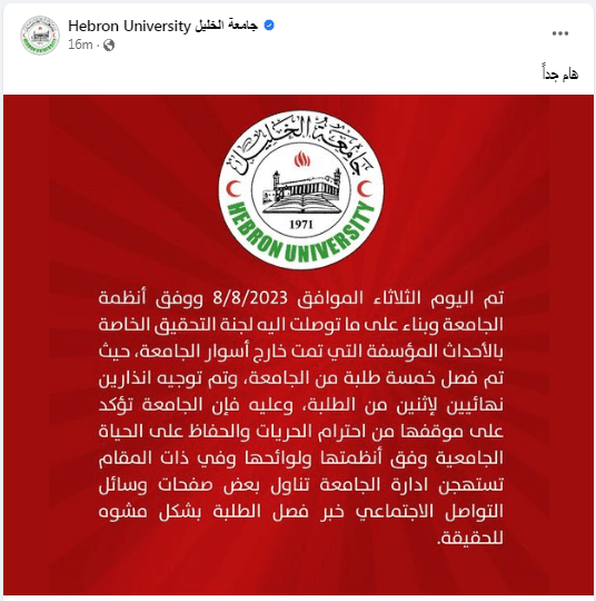 جامعة الخليل تفصل 5 طلّاب بشكل نهائي