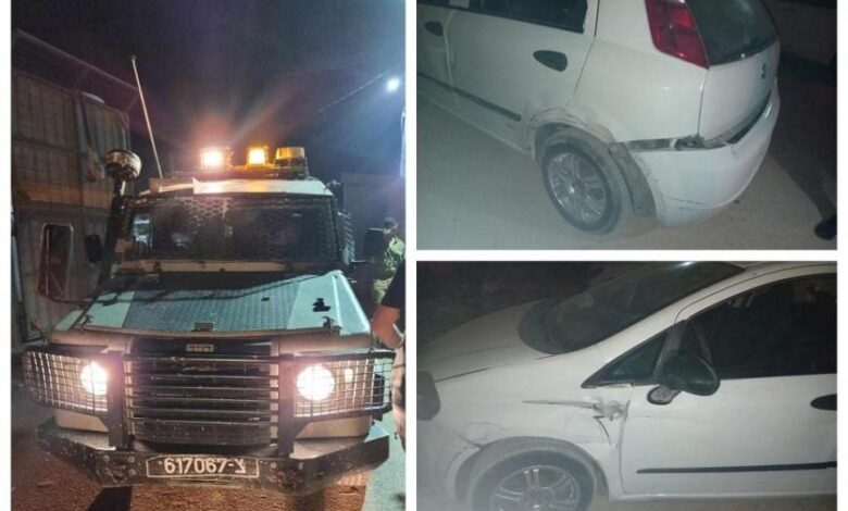 وذكر شهود عيان، ان مصفحات قوات الاحتلال العسكرية صدمت بشكل متعمد مركبات المواطنين المتوقفة على جانب الطريق في منطقة قبة جانب بالخليل، وألحقت أضرارا بها.