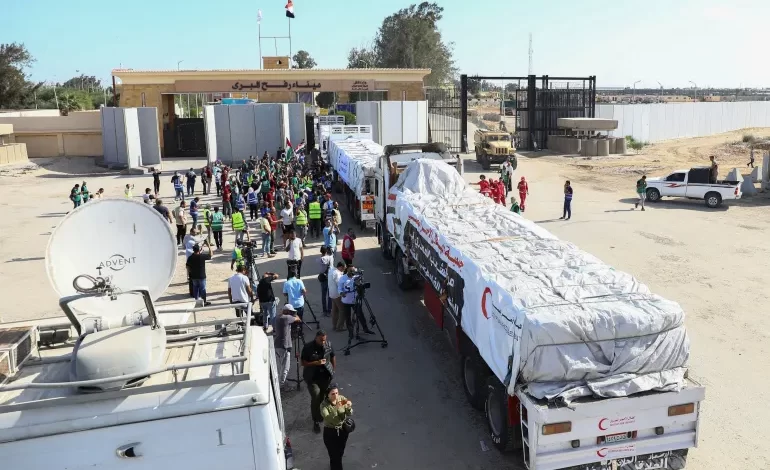 عبرت اليوم الأحد قافلة ثانية من المساعدات إلى قطاع غزة عن طريق معبر رفح الحدودي مع مصر، وتضم القافلة 17 شاحنة من المفترض أن تدخل القطاع بعد تفتيشها.