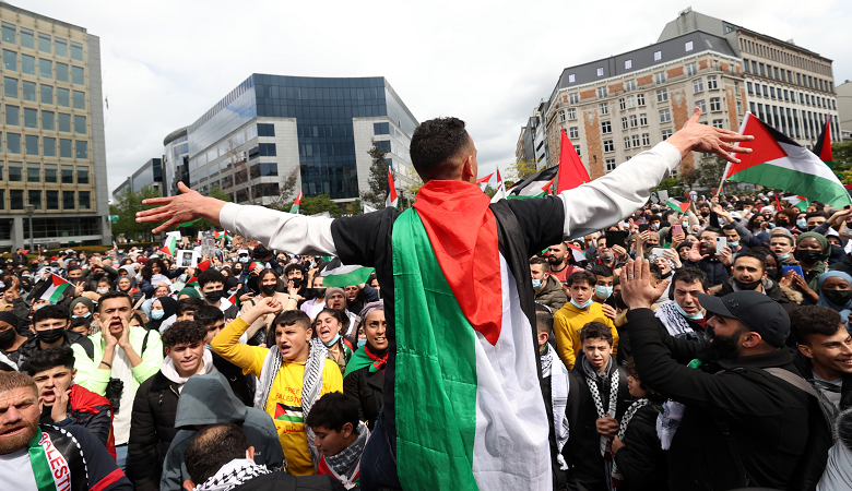 ورفع المشاركون في المظاهرة، الأعلام الفلسطينة ورددوا شعارات مثل “فلسطين حرة”، و”أوقفوا المجازر في غزة”.