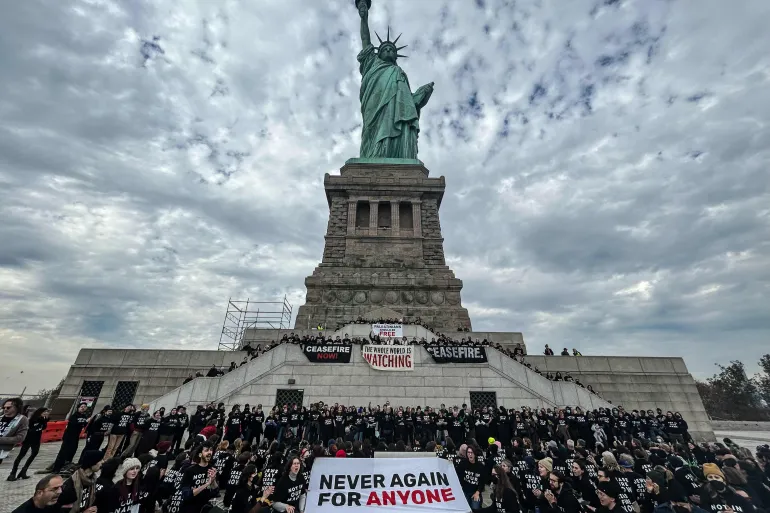 احتلّ مئات الناشطين اليهود الأميركيين التقدميّين تمثال الحرية في نيويورك لمطالبة إسرائيل بوقف إطلاق النار في غزة، ووضع حدّ لما يتسبّب به قصفها من إبادة جماعية للمدنيين في القطاع.