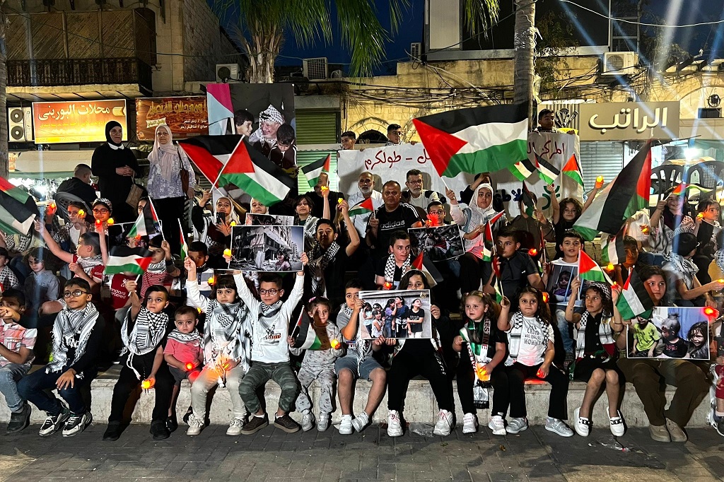 ورفع الأطفال في وقفتهم التي جاءت تلبية لدعوة من المركز الثقافي لتنمية الطفل، الأعلام الفلسطينية وصور الأطفال الشهداء في غزة، وأضاؤوا الشموع، وسط ميدان جمال عبد الناصر في المدينة.