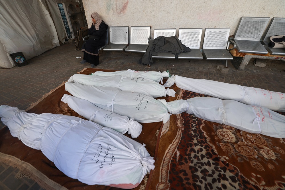 EDITORS NOTE: Graphic content / A Palestinian woman mourns at al-Najjar hospital near the shrouded bodies of relatives killed in Israeli bombing on Rafah in the southern Gaza Strip on December 3, 2023, amid continuing battles between Israel and the militant group Hamas. (Photo by MOHAMMED ABED / AFP)