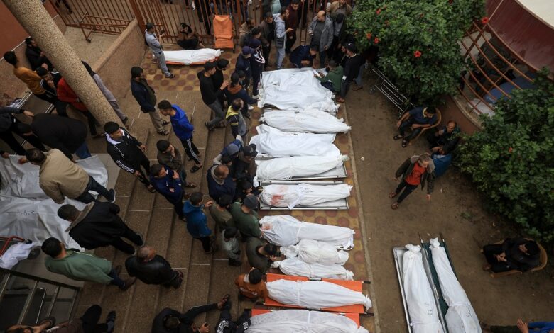 ووصل مستشفى شهداء الأقصى في دير البلح وسط القطاع، 45 شهيدا وعشرات الإصابات جراء قصف طيران الاحتلال لمنزل عائلة أبو مصبح في المدينة، الذي يؤوي نازحين.