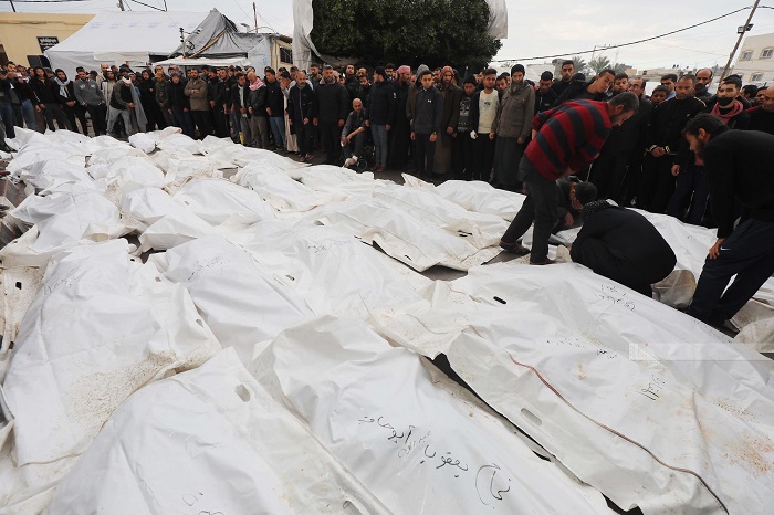 وتكدست ساحة مستشفى شهداء الأقصى بدير البلح وسط قطاع غزة بجثامين الشهداء، بانتظار مواراتهم الثرى.