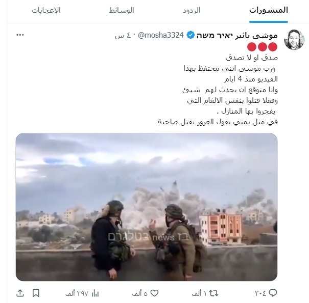 وكتب الصحفي الإسرائيلي موشي يائير عن مقتل جنود الاحتلال في قطاع غزة “صدق او لا تصدق.. ورب موسى إنني محتفظ بهذا الفيديو منذ 4 أيام، وأنا متوقع ان يحدث لهم شيء وفعلا قتلوا بنفس الألغام التي يفجرون بها المنازل. في مثل يمني يقول الغرور يقتل صاحبه”.