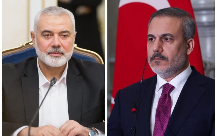 بحث وزير الخارجية التركي، هاكان فيدان، ورئيس المكتب السياسي لحركة حماس، إسماعيل هنية، تطورات الأوضاع في غزة.