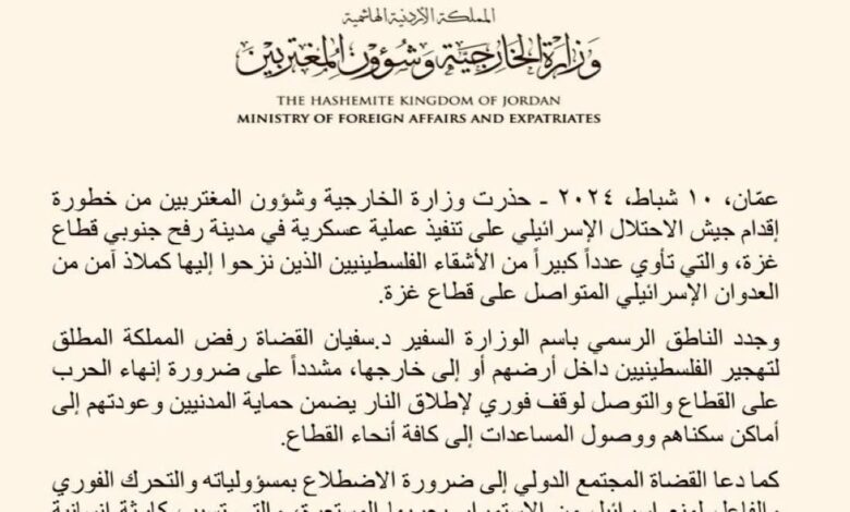 حذرت وزارة الخارجية وشؤون المغتربين الأردنية من خطورة إقدام جيش الاحتلال الإسرائيلي على تنفيذ عملية عسكرية في مدينة رفح جنوب قطاع غزة، التي تؤوي عددا كبيرا من الأشقاء الفلسطينيين، الذين نزحوا إليها كملاذ آمن من العدوان الإسرائيلي المتواصل على قطاع غزة.