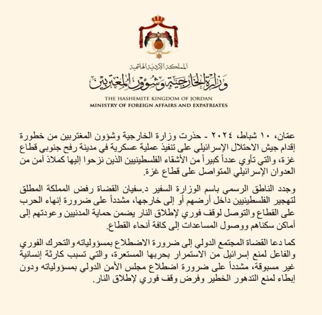 حذرت وزارة الخارجية وشؤون المغتربين الأردنية من خطورة إقدام جيش الاحتلال الإسرائيلي على تنفيذ عملية عسكرية في مدينة رفح جنوب قطاع غزة، التي تؤوي عددا كبيرا من الأشقاء الفلسطينيين، الذين نزحوا إليها كملاذ آمن من العدوان الإسرائيلي المتواصل على قطاع غزة.