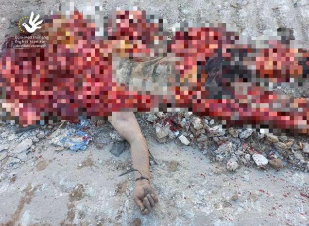 وتظهر آثار واضحة لجرافة عسكرية أو دبابة على جسد الضحية المتهتك تمامًا والمنطقة المحيطة، فيما تم تجريد الضحية من ملابسه بشكل متعمد، حيث يظهر مرتديًا فقط بنطاله الداخلي.