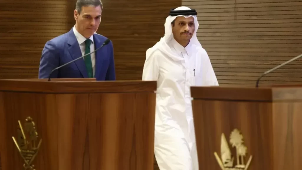 وقال آل ثاني خلال مؤتمر صحفي مع رئيس الوزراء الإسباني بيدرو سانشيز، إن المباحثات بين الجانبين تناولت الوضع في غزة والهجوم على القنصلية الإيرانية في دمشق، والغارة على موظفي المطبخ المركزي العالمي بغزة.