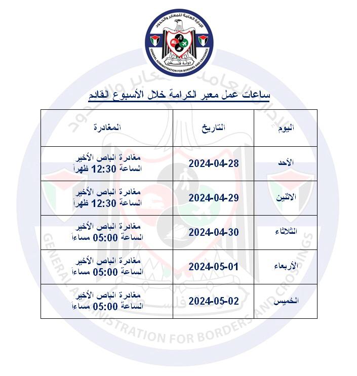 أعلنت الإدارة العامة للمعابر والحدود، اليوم الخميس، عن تعديل ساعات عمل معبر الكرامة للأسبوع المقبل ،علماً أن المعبر مغلق يوم السبت الموافق 27/4/2024م .