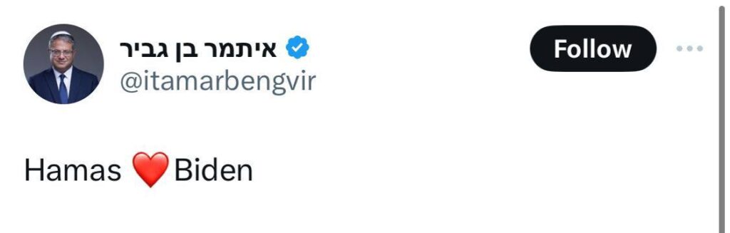 وكتب بن غفير منشورا رمز فيه إلى “حب” حركة حماس للرئيس بايدن بعد تصريحات الأخير الذي هدد فيه إسرائيل بوقف إمدادات أسلحة في حال واصلت عمليتها في رفح.