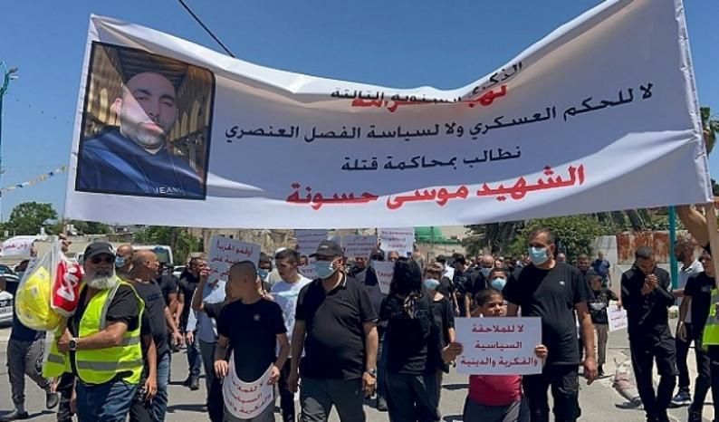 ورفع المتظاهرون لافتات كُتبت عليها شعارات مطالبة بمحاكمة قتلَة الشهيد موسى حسونة، من قبيل: “محاكمة القتلة الآن”، و”لا للإفلات من العقوبة”