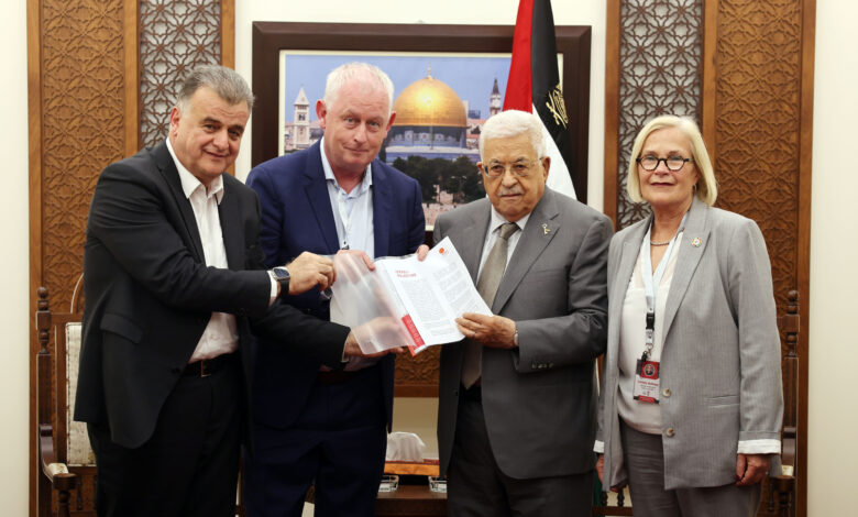 استقبل رئيس دولة فلسطين محمود عباس، مساء اليوم الأربعاء، بمقر الرئاسة في مدينة رام الله، وفدا تضامنيا نقابيا دوليا يضم الأمناء العامين للاتحادات المهنية في العالم، الذين يمثلون أكثر من 270 مليون نقابي، برئاسة رئيس الاتحاد الدولي لنقابات العمال لوك تريانغل.