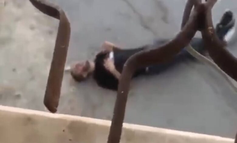 ويظهر المقطع نطق الشاب للشهادتين وتلقيه رصاصتين على الأقل