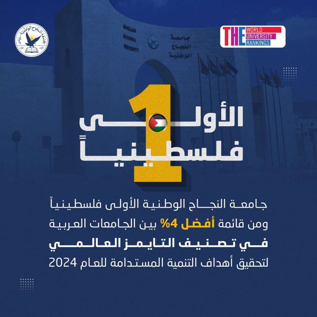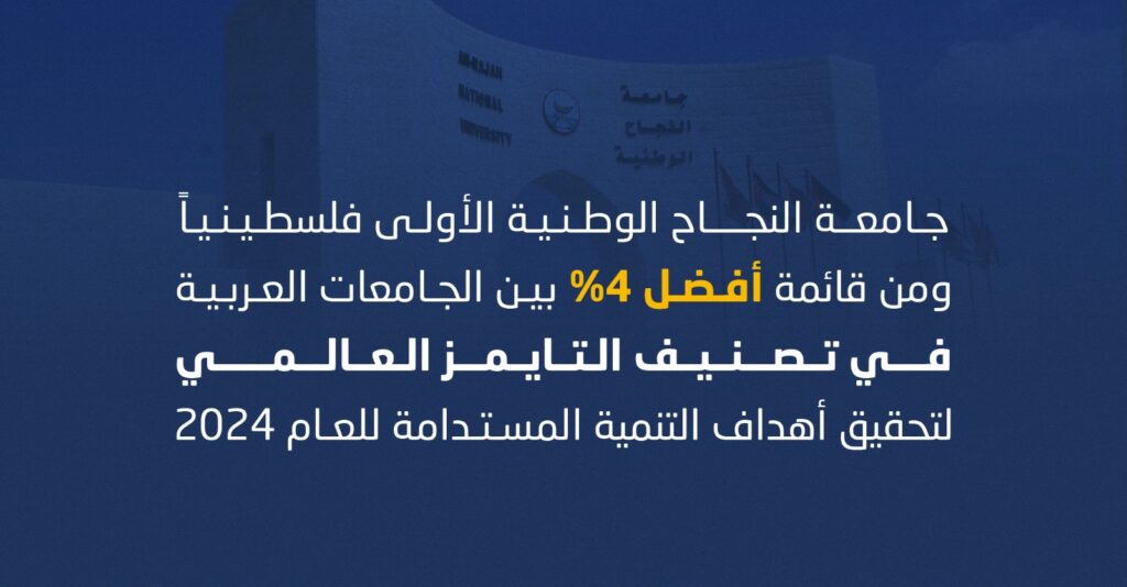 جامعة النجاح الوطنية الأولى فلسطينياً ومن قائمة أفضل 4% بين الجامعات العربية في تصنيف التايمز العالمي لتحقيق أهداف التنمية المستدامة للعام 2024