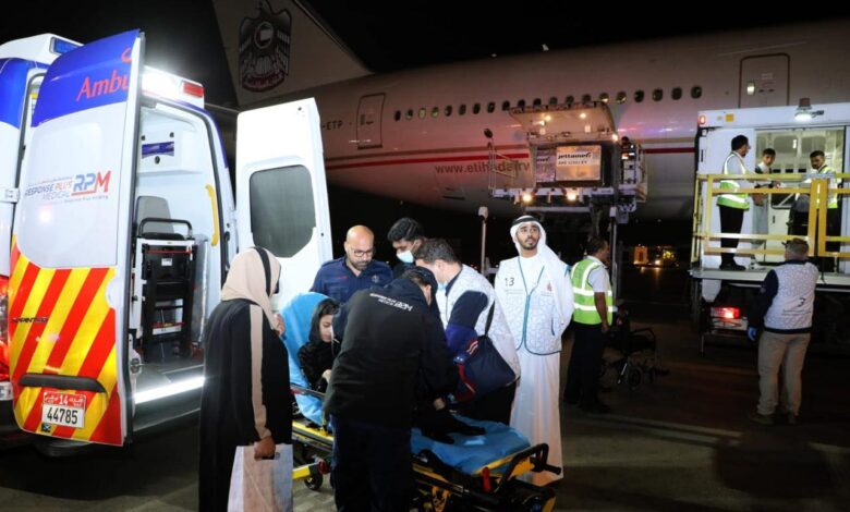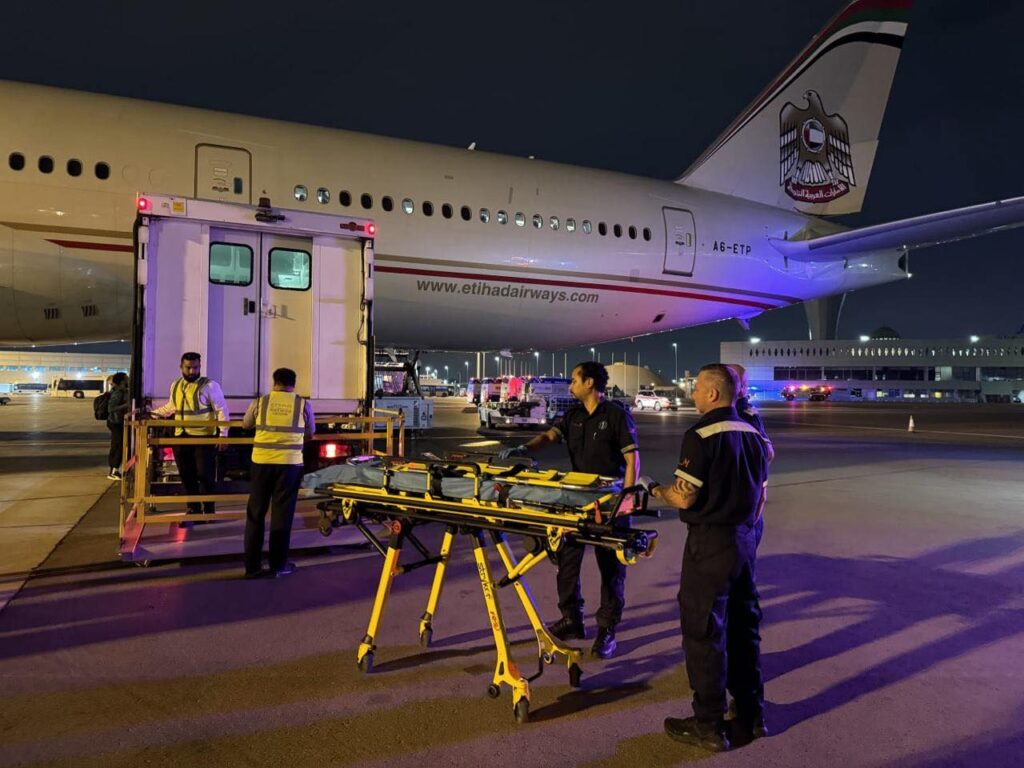 وفور وصول طائرة الاتحاد للطيران والقادمة من العريش إلى مطار زايد الدولي، قامت الفرق الطبية المتواجدة على أرض المطار بعملية نقل الجرحى والمصابين التي تستدعي حالاتهم نقلهم بشكل فوري إلى المستشفيات لتلقي الرعاية الصحية.
