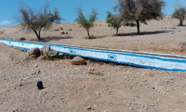 رسم مستوطنون، اليوم الثلاثاء، علم دولة الاحتلال الإسرائيلي على مجرى مياه نبع العوجا شمال مدينة أريحا.