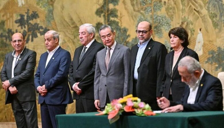 ويأتي ذلك بعدما وقّعت الفصائل الفلسطينية، في وقتٍ سابق اليوم، على “إعلان بكين”، لإنهاء الانقسام وتشكيل حكومة وفاق وطني وتعزيز الوحدة الوطنية الفلسطينية، وذلك في الحفل الختامي لحوار المصالحة بين الفصائل الذي عُقِدَ في بكين من 21 إلى 23 تموز/يوليو الجاري.