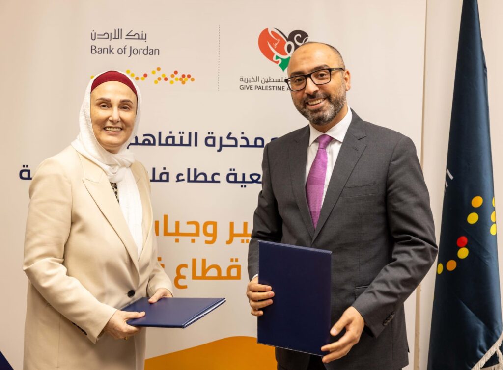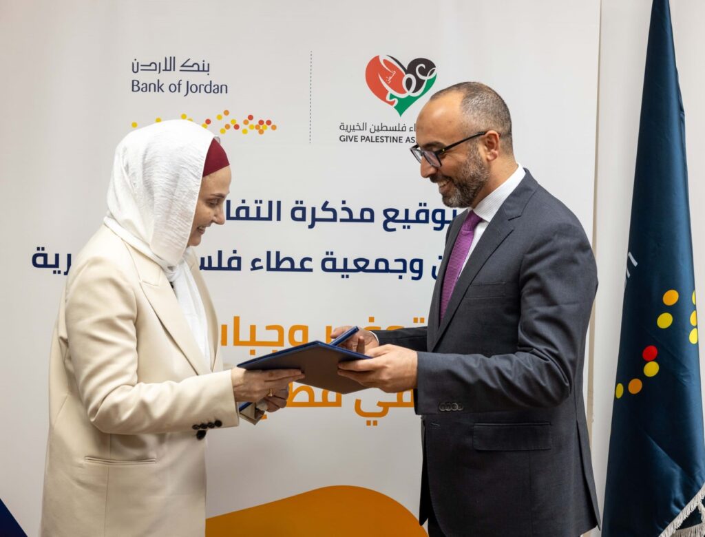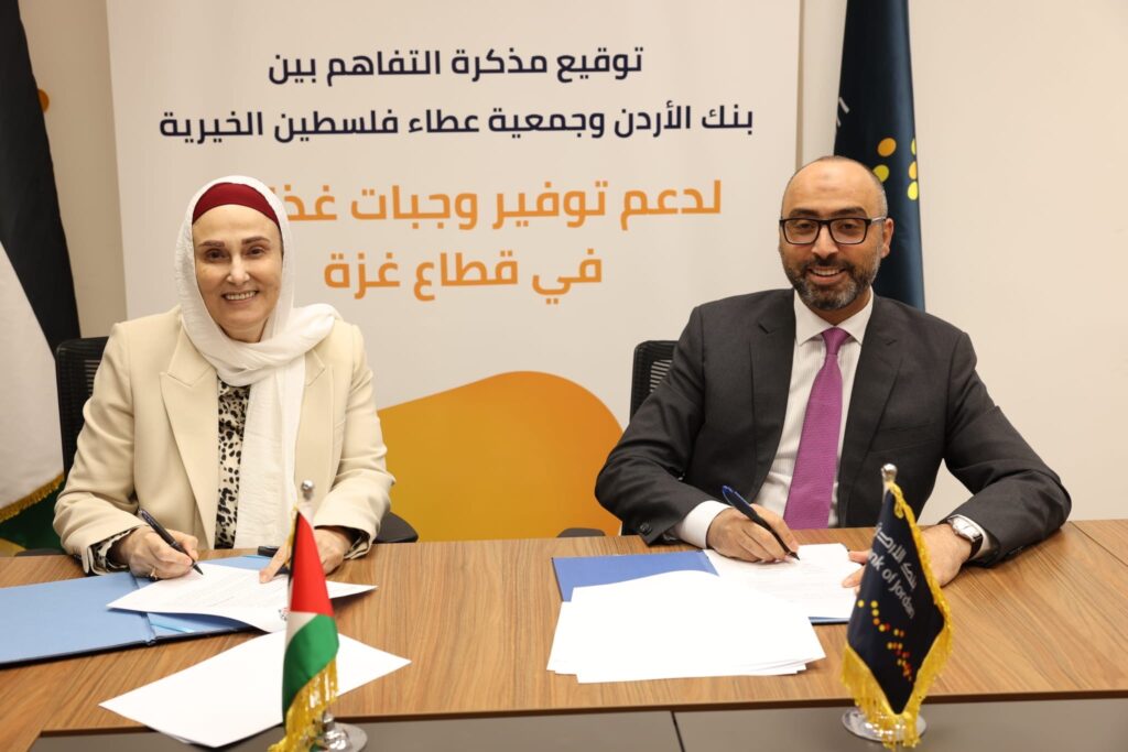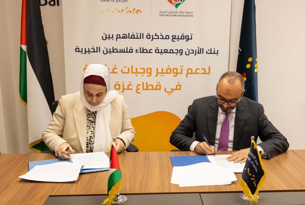 وقع بنك الأردن في فلسطين مذكرة تفاهم مع جمعية عطاء فلسطين، بهدف توفير وتوزيع وجبات غذائية في شمال قطاع غزة. وجرى توقيع المذكرة في مقر الإدارة الإقليمية لبنك الأردن في رام الله، بحضور الرئيس التنفيذي لفروع بنك الأردن في فلسطين، السيد ” سيف عيسى”، والمدير العام لجمعية عطاء فلسطين الدكتورة ” رجاء أبو غزالة شعث” وعدد من موظفي الإدارة من الطرفين.