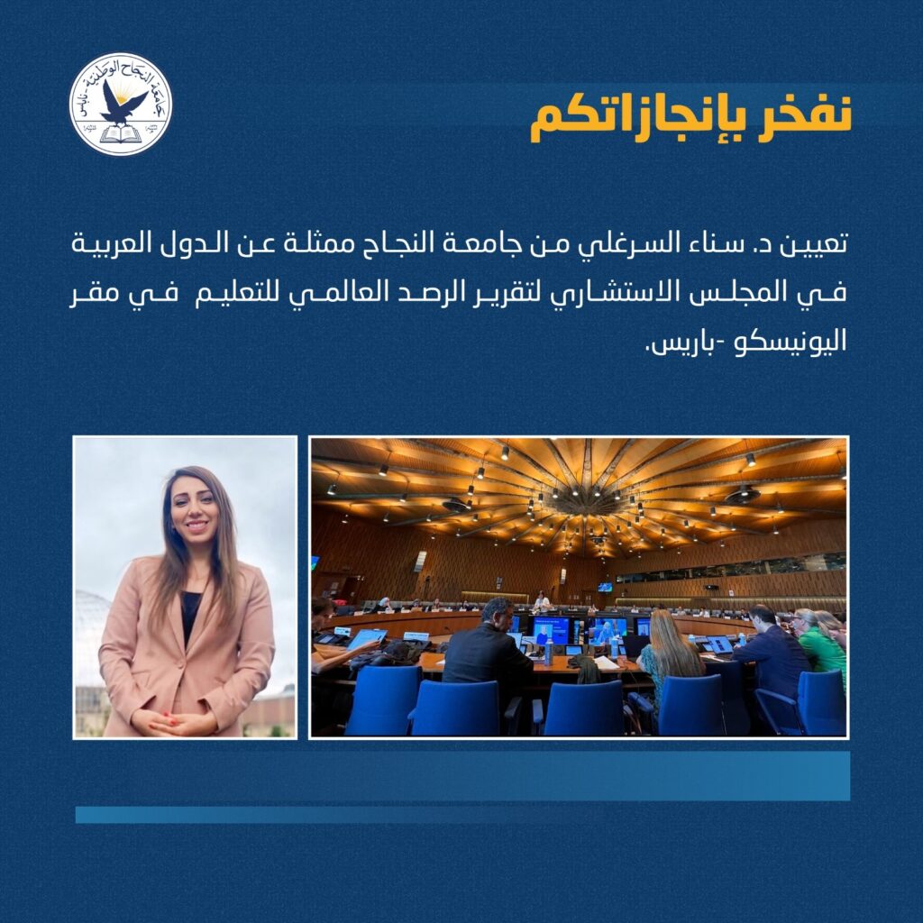 في خطوة جديدة تعكس التميز الأكاديمي والقيادي للأكاديميين الفلسطينيين في المحافل الدولية، أعلنت جامعة النجاح الوطنية عن تعيين الدكتورة سناء السرغلي، حاملة كرسي اليونسكو لحقوق الإنسان والديمقراطية والسلام في مقر اليونيسكو – باريس، كممثلة عن الدول العربية في المجلس الاستشاري لتقرير الرصد العالمي للتعليم (Global Monitoring Report) لمدة عامين.