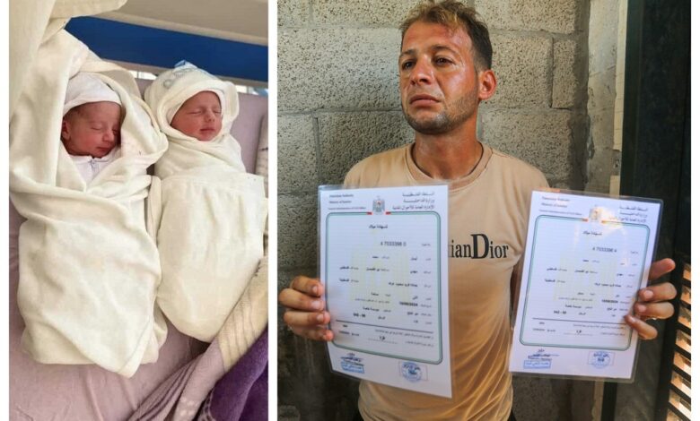 غادر المواطن محمد أبو القمصان من مكان نزوحه في مدينة دير البلح، في وقت مبكّر صباح اليوم الثلاثاء، تغمره الفرحة لتسلم شهادتي ميلاد طفليه التوأم، آسر وآيسل، اللذان ولدا قبل ثلاثة أيام، في ظروف حرب الإبادة القاسية ورحلات النزوح من مكان لآخر.