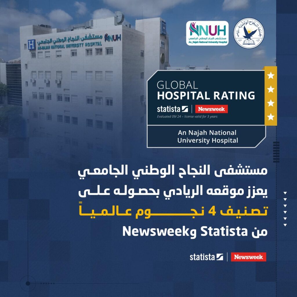في خطوة جديدة تؤكد ريادة مستشفى النجاح الوطني الجامعي في القطاع الصحي المحلي والدولي، حصل المستشفى على تصنيف 4 نجوم من مؤسسة Statista بالتعاون مع مجلة Newsweek العالمية، بالإضافة إلى إدراجه ضمن تصنيفات Global Hospital Rating، ليصبح بذلك من أوائل المستشفيات في المنطقة التي تحظى بهذا التصنيف المرموق.