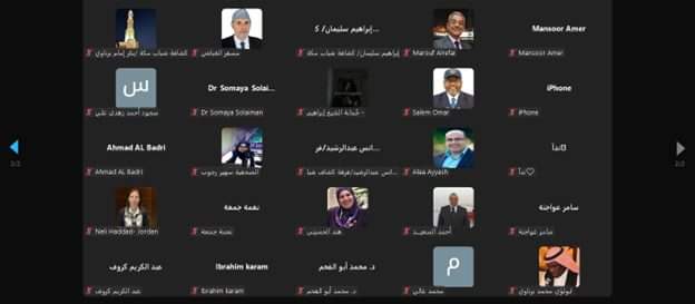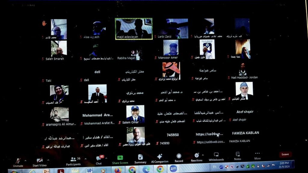 وترأست الجلسة الدكتورة ريما دراغمة رئيس الهيئة، إذ تم استضافة رؤساء هيئات رواد عربية ورؤساء لجان في الاتحاد العربي، وهم الرائد الدكتور الفيتوري ضو مفتاح رئيس رابطة رواد ليبيا ونائب رئيس اللجنة التنفيذية بالاتحاد العربي، والرائد الدكتور عبد الله الفهد رئيس رابطة رواد كشافة ومرشدات السعودية وعضو اللجنة التنفيذية بالاتحاد العربي لرواد الكشافة والمرشدات، والرائدة الدكتورة ربيحة المجالي رئيس رابطة رواد كشافة ومرشدات الأردن ومستشار الرائدات بالاتحاد العربي، والرائد الحاج تقي رئيس رابطة رواد كشافة ومرشدات الجزائر وعضو اللجنة التنفيذية بالاتحاد العربي.