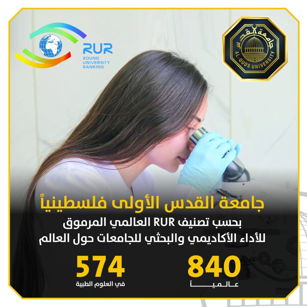 حصدت جامعة القدس المرتبة الأولى فلسطينيًا والمرتبة 840 عالميًا بحسب تصنيف (Round University Ranking (RUR العالمي، والذي يقدّم نظرة شاملة على الأداء الأكاديمي والبحثي للجامعات حول العالم، ويستند إلى 20 مؤشر مختلف يغطي جوانب متعددة مثل جودة التعليم، البحث العلمي، التنوع الدولي، والاستدامة المالية.