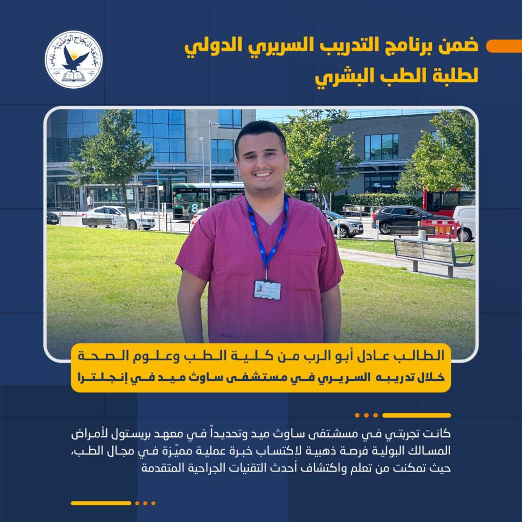 الطالب عادل غسان أبو الرب من برنامج الطب البشري في جامعة النجاح الوطنية يحصل على فرصة تدريبية مميزة في مستشفى ساوث ميد في إنجلترا