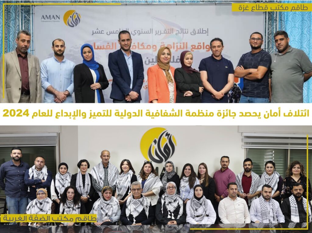 وقد رشّح عدد من فروع الشفافية الدولية ائتلاف أمان على مواصلة عمله الدؤوب، في ظل الظروف المؤلمة وغير المسبوقة التي يمرّ بها القطاع، بالتلازم مع الأخبار الحزينة التي كانت ترد عند استشهاد أقارب وعائلات أفراد الطاقم، وعدد من الأصدقاء، والصحافيين/ات ممن تلقّوا التدريبات على إنتاج التحقيقات الاستقصائية مع ائتلاف أمان، ومقدّمي الخدمات، والشركاء العاملين معه، كذلك أعضاء فاعلين في الفريق الاهلي لدعم شفافية الموازنة العامة، والذي يعد ائتلاف أمان السكرتارية التنفيذية له. وقد تم اختيار الفائزين بالجائزة من قبل لجنة جوائز مكافحة الفساد التابعة لمجلس إدارة منظمة الشفافية الدولية، حيث نال طاقم ائتلاف أمان العامل في الضفة وقطاع غزة، جائزة فريق العمل للتميّز والإبداع.