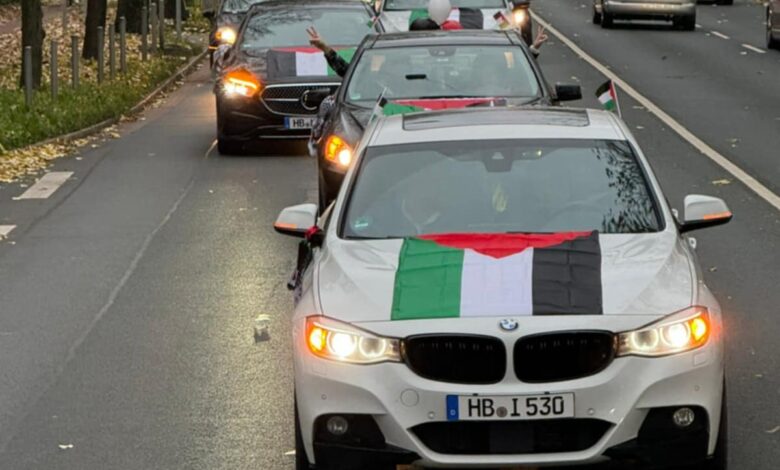 وشارك في المسيرة 300 مركبة أغلقت جميع مداخل مدينة بريمن، رُفعت عليها الأعلام الفلسطينية، واللافتات التي تُعبر عن التضامن مع الشعب الفلسطيني وتُندد بالجرائم البشعة التي يرتكبها جيش الاحتلال بحق شعبنا.