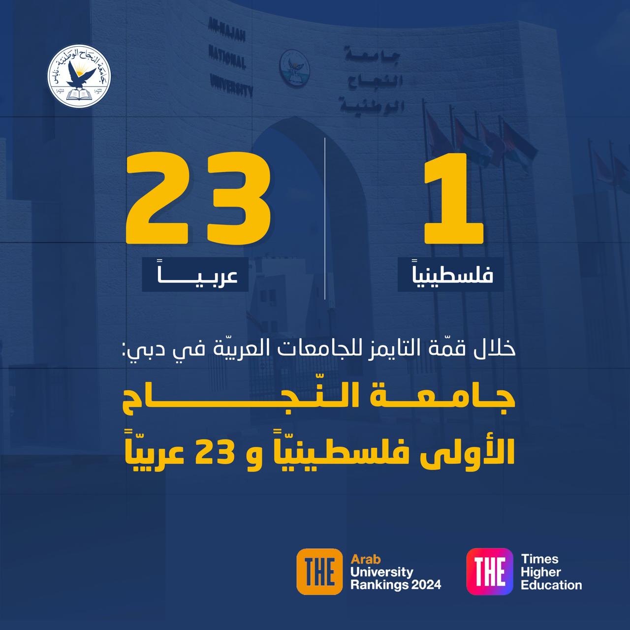 ويأتي هذا الإنجاز تتويجاً للقفزة النوعية التي حققتها الجامعة من خلال تقدمها في معظم معايير التقييم، مما جعلها ضمن أفضل 10% من الجامعات العربية المدرجة في التصنيف. وقد شمل التصنيف أكثر من 239 جامعة من 17 دولة عربية، وكانت جامعة النجاح الوطنية الأفضل بين أربع جامعات فلسطينية فقط تمكنت من دخول التصنيف، مما يعكس ريادتها في مجال التعليم العالي والتزامها الدائم بالتميز الأكاديمي والبحث العلمي.