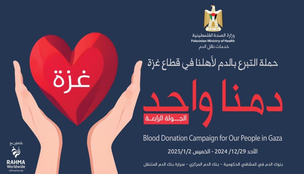 رام الله 27-12-2024 تلفزيون الفجر- دعت وزارة الصحة، أبناء شعبنا في المحافظات الشمالية، للتبرع بالدم لصالح الجرحى والمرضى في المحافظات الجنوبية، ضمن الجولة الرابعة لحملة “دمنا واحد”.