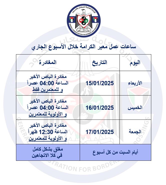 ساعات العمل على معبر الكرامة خلال الأسبوع الجاري