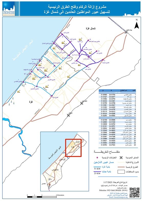 ويأتي ذلك انطلاقاً من واجبها الإنساني وبناء على توجيهات رئيس الوزراء محمد مصطفى، وبالتعاون مع هيئة الصناديق العربية والإسلامية ووزارة الدولة لشؤون الإغاثة، حيث ستباشر الهيئة العربية الدولية للإعمار في فلسطين AIOCP فور بدء سريان وقف إطلاق النار، بتوفير الآليات المناسبة لفتح وتسوية وإزالة الركام من الطرق الرئيسية لمدينة غزة وجباليا كمرحلة أولى لتسهيل عودة المواطنين إلى شمال غزة، وبالتنسيق مع بلديتي غزة جباليا.