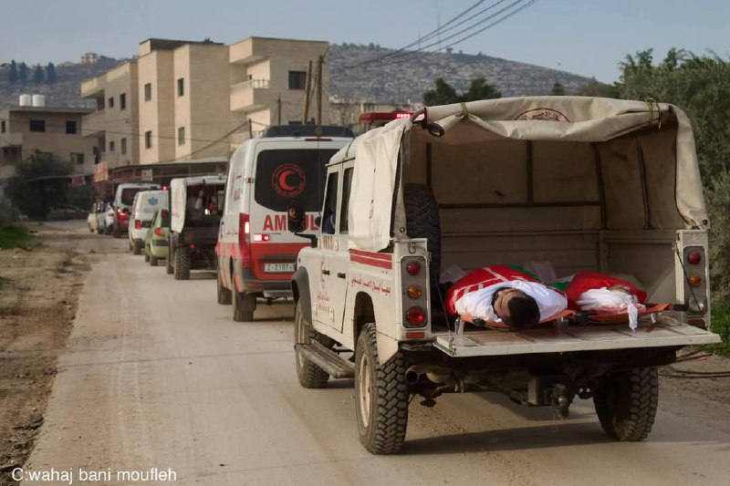 ونقلت طواقم الهلال الأحمر جثامين 7 شهداء من مستشفيي جنين الحكومي وابن سينا عبر مركبات الإسعاف إلى مقبرة الشهداء في جنين حيث جرى الصلاة على جثامينهم ومواراتهم الثرى.
