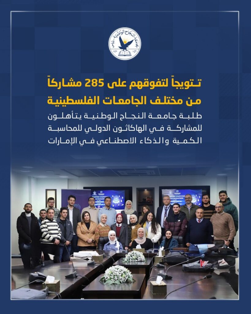 بعد تفوقهم على 285 مشاركاً من مختلف الجامعات الفلسطينية.. طلبة جامعة النجاح الوطنية يتأهلون للمشاركة في الهاكاثون الدولي للمحاسبة الكمية والذكاء الاصطناعي في الإمارات
