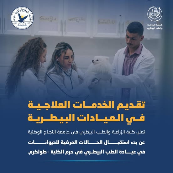 تعلن كلية الزراعة والطب البيطري في جامعة النجاح الوطنية عن بدء استقبال الحالات المرضية للحيوانات في عيادة الطب البيطري في حرم الكلية -طولكرم.