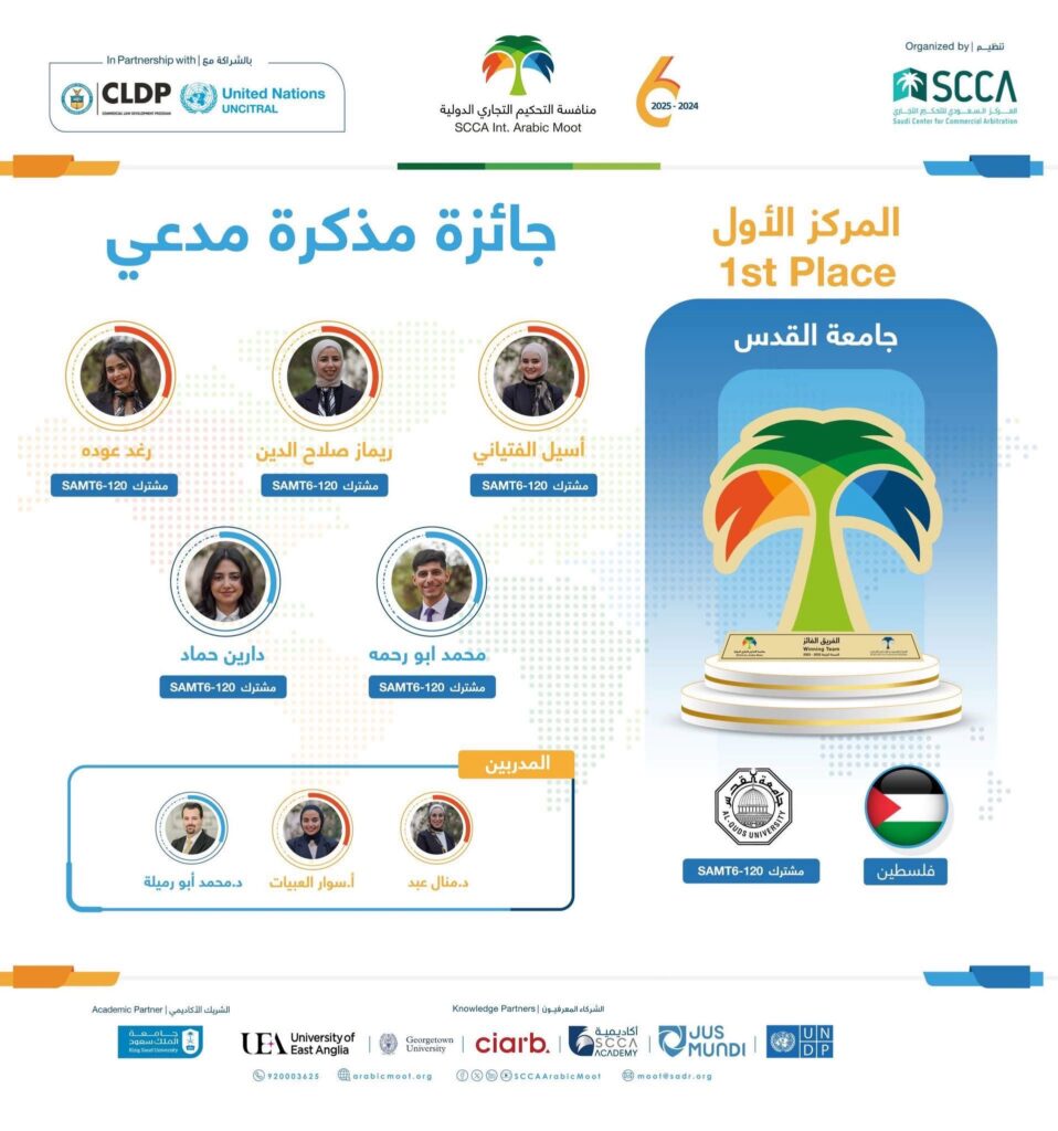 فاز فريق كلية الحقوق في جامعة القدس بالمركز الأول في المرافعات الكتابية ضمن منافسة التحكيم التجاري الدولية في الرياض، متفوقًا على 154 فريقًا مشاركًا من 24 دولة، ليكون بذلك الفريق الفلسطيني الوحيد الذي يحصد الجائزة لإحدى المراكز الأولى في المنافسة، والتي شهدت مشاركة فاعلة لثماني جامعات فلسطينية.