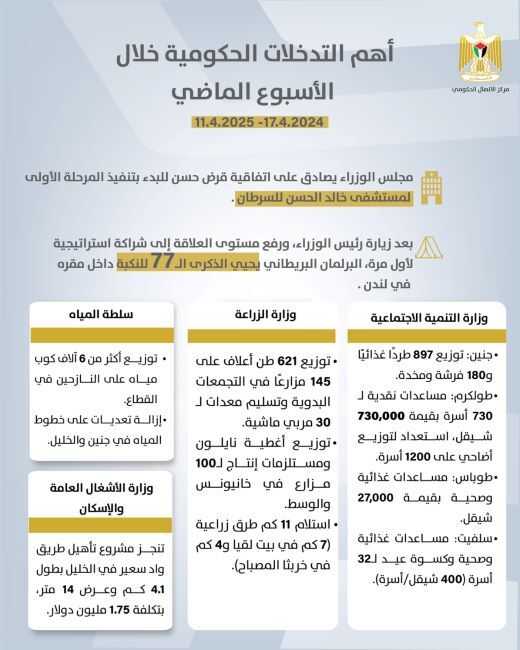 أصدر مركز الاتصال الحكومي تقريرًا يبرز أهم التدخلات التنموية والإصلاحية التي نَفذَّتها الحكومة، خلال الأسبوع الماضي (11/4/2025 – 17/4/2025).
