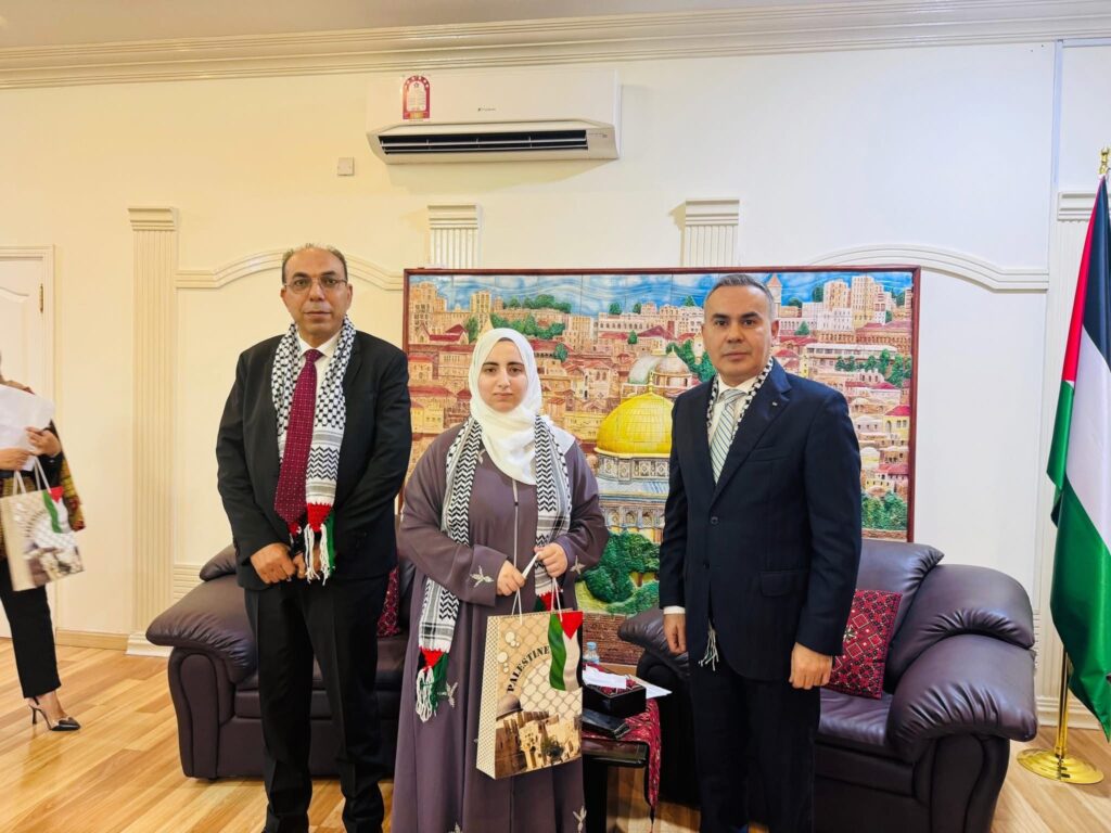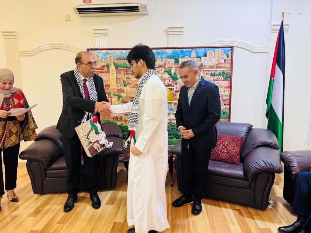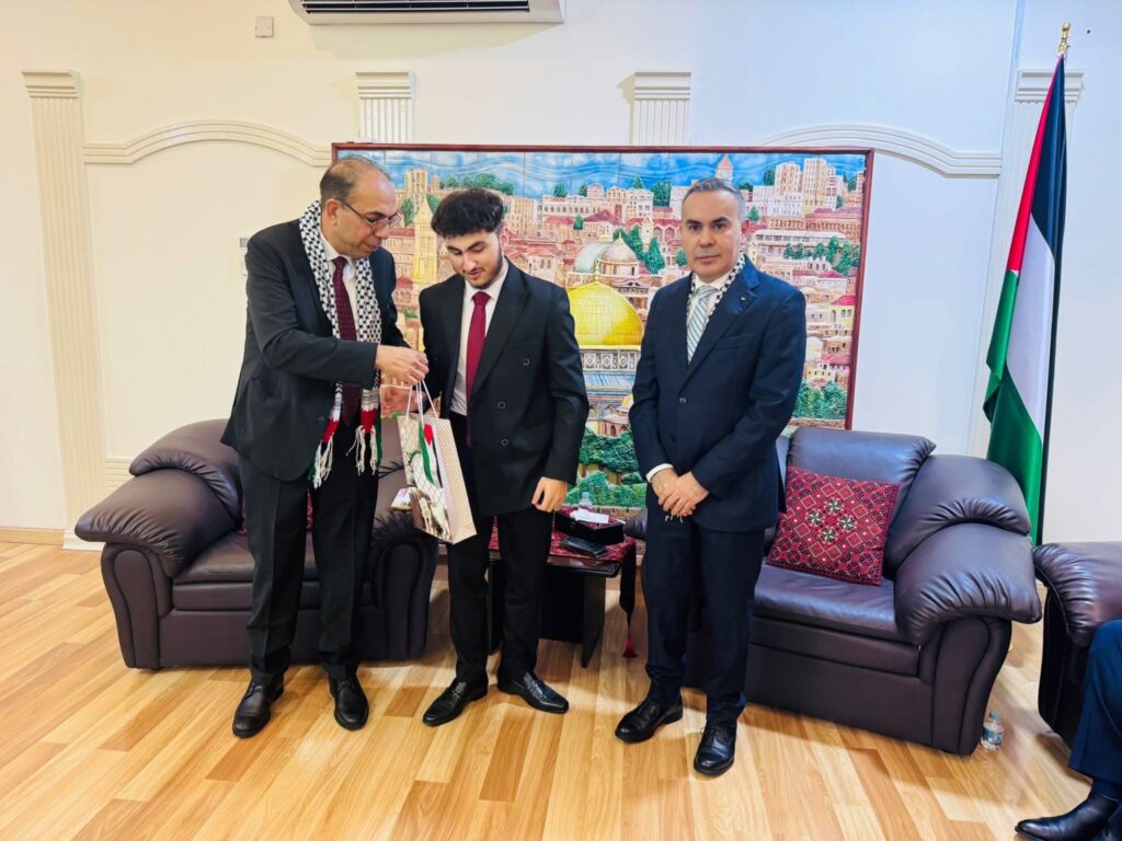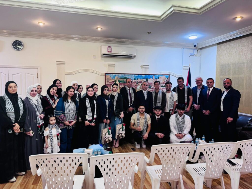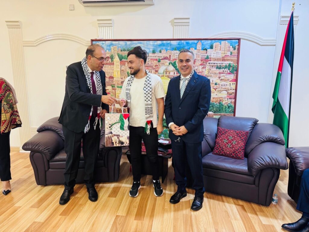 السفير فاير ابو الرب للمشاركين ىالمتفوقين والحضور تحيات وتهاني فخامة الرئيس محمود عباس، رئيس دولة فلسطين، لأبنائه الطلبة، معبّرًا عن تقدير القيادة الفلسطينية لإنجازاتهم المشرفة رغم ما يواجهه الشعب الفلسطيني من تحديات. كما وجّه السفير الشكر