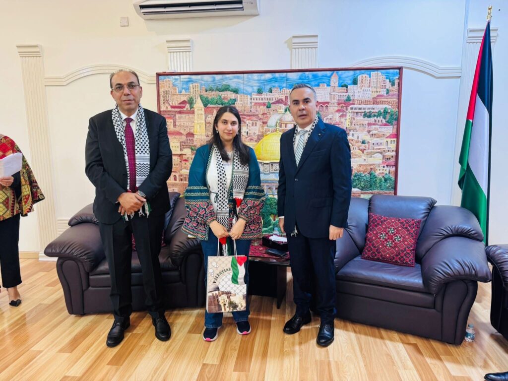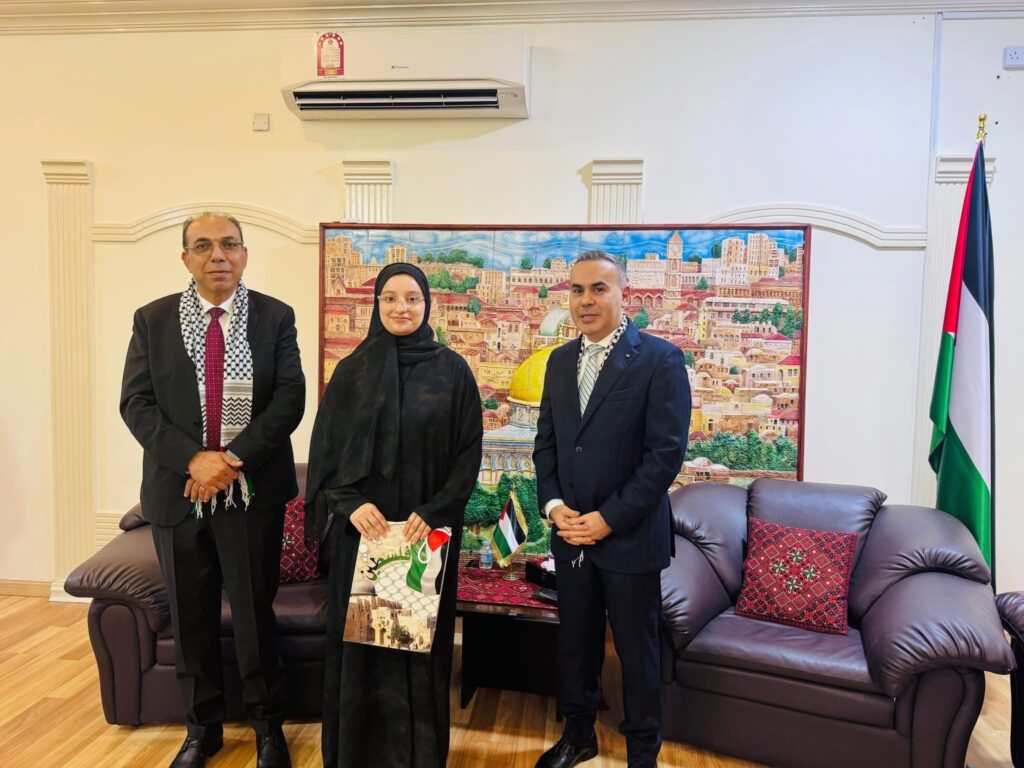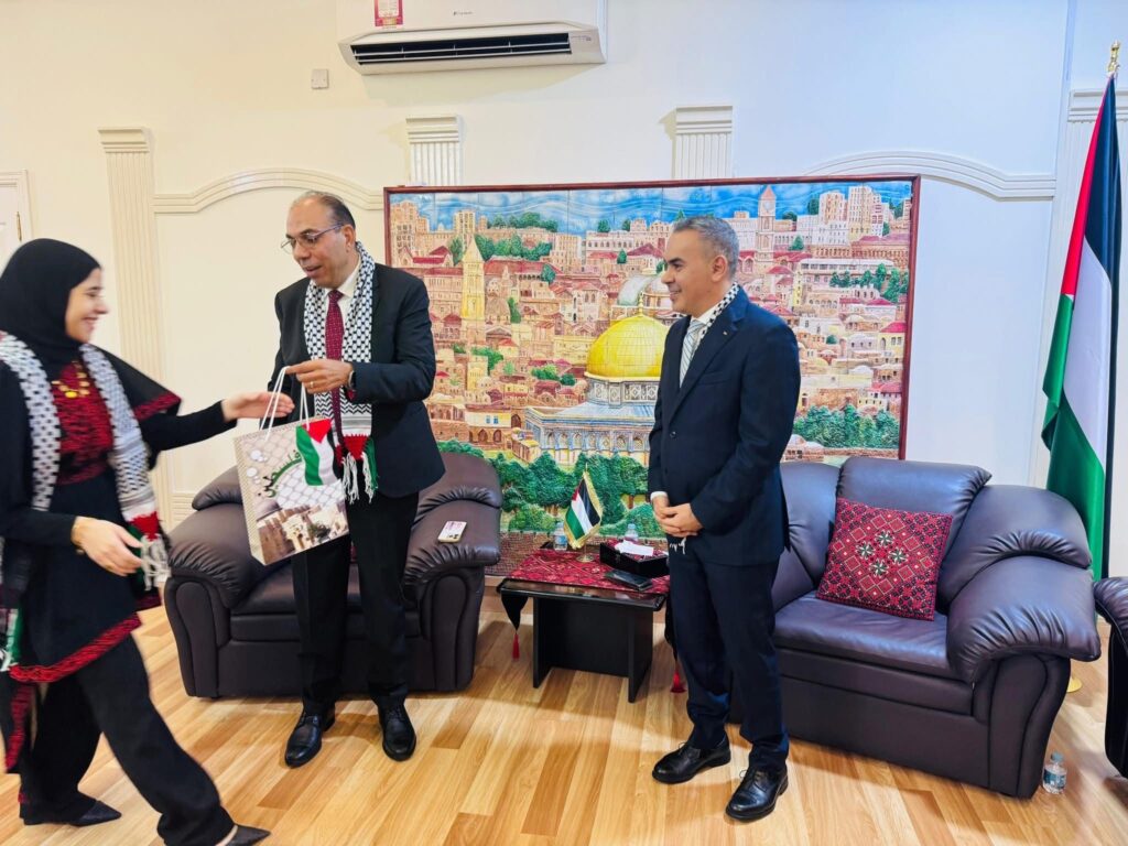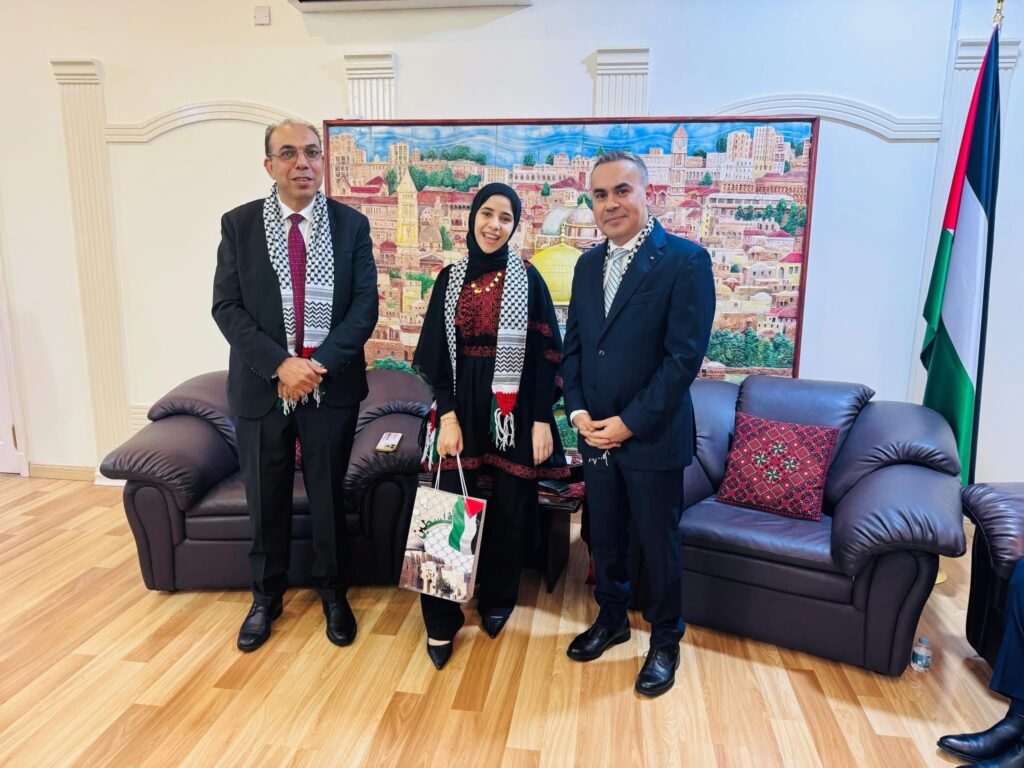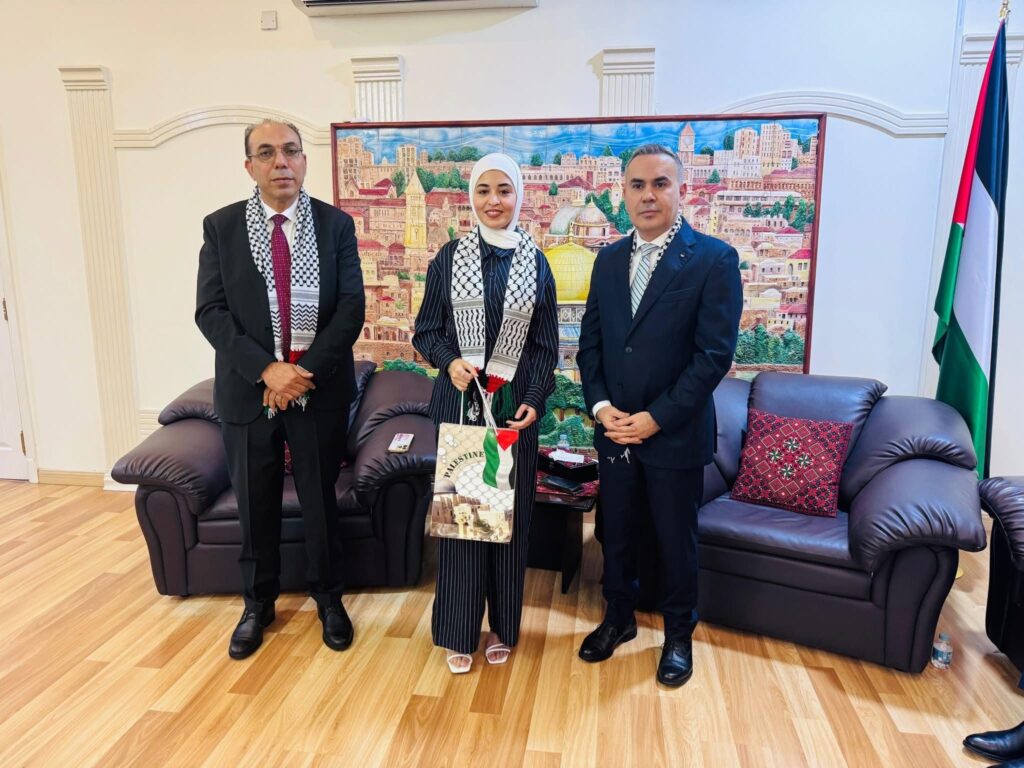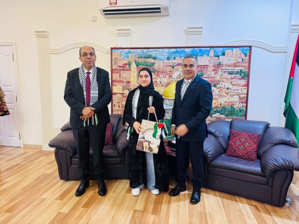 السفير فاير ابو الرب للمشاركين ىالمتفوقين والحضور تحيات وتهاني فخامة الرئيس محمود عباس، رئيس دولة فلسطين، لأبنائه الطلبة، معبّرًا عن تقدير القيادة الفلسطينية لإنجازاتهم المشرفة رغم ما يواجهه الشعب الفلسطيني من تحديات. كما وجّه السفير الشكر