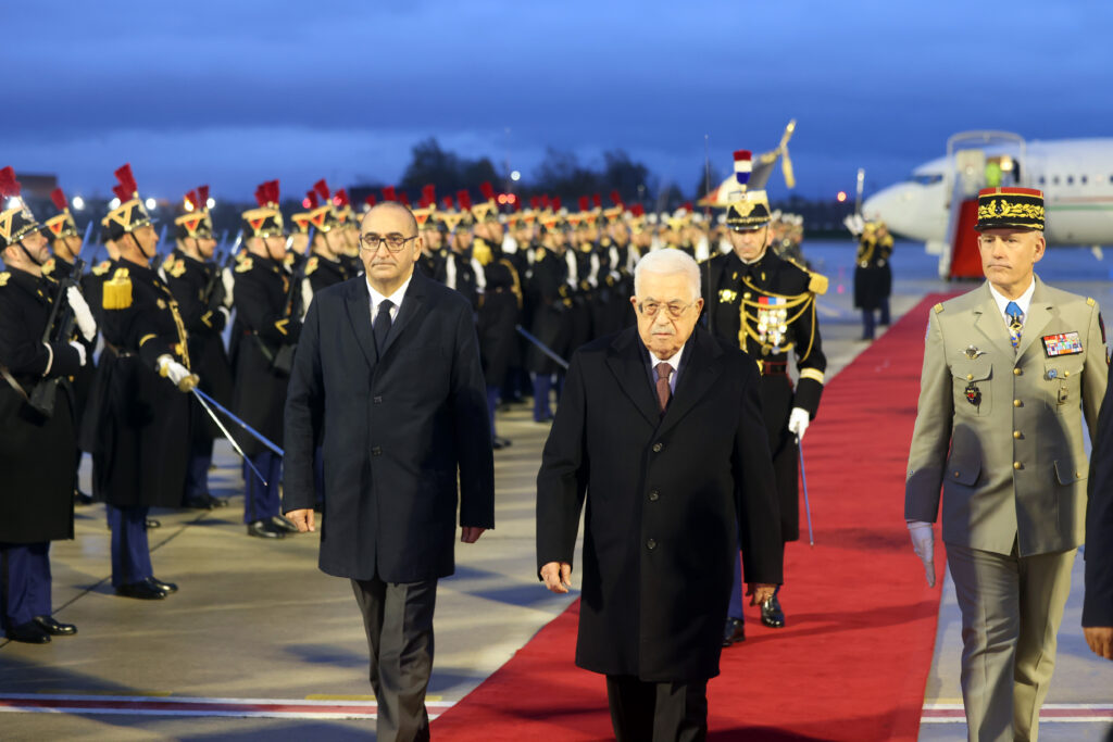 ولدى وصوله، استعرض حرس الشرف الذي اصطف لتحيته، فيما عزف السلامان الوطنيان الفلسطيني والفرنسي وكان في استقباله وزير الداخلية الفرنسي لوران نونيز.