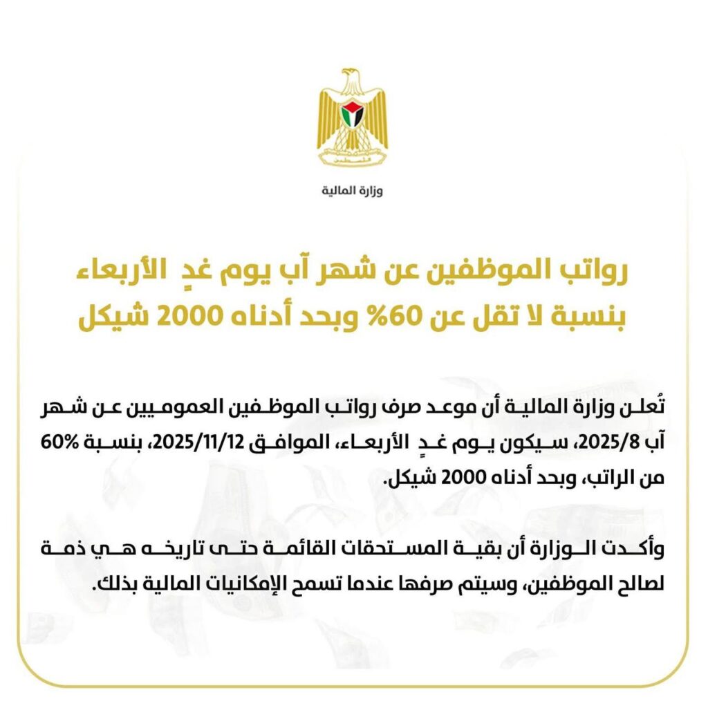أعلنت وزارة المالية، أن موعد صرف رواتب الموظفين العموميين عن شهر آب 2025/8، سيكون يوم غد الأربعاء، بنسبة 60% من الراتب، وبحد أدناه 2000 شيقل.