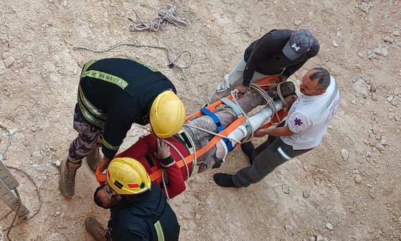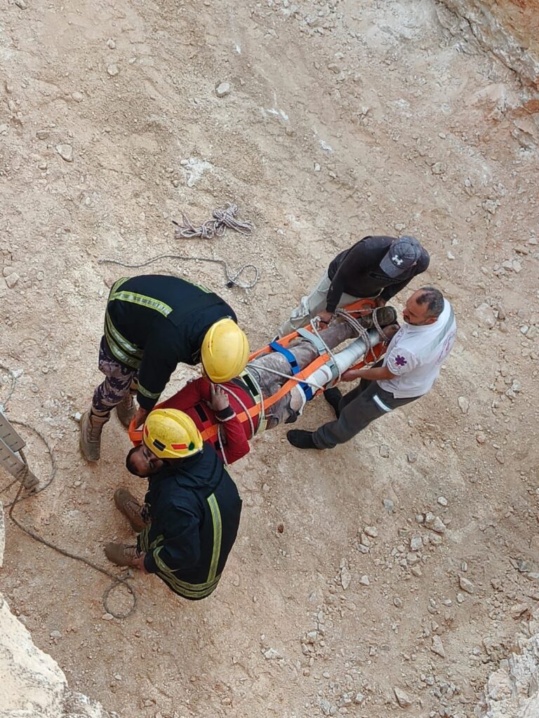 وقد عملت الطواقم على تقديم الإسعافات الأولية اللازمة للمصاب، وتثبيت إصابته على لوح طبي، قبل إخلائه من داخل الحفرة وتسليمه لمركبة الهلال الأحمر، إضافة إلى تأمين موقع الحادث.
