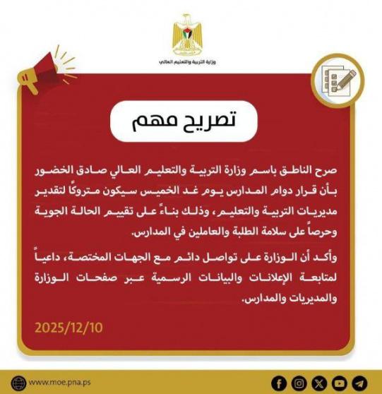 وفي السياق ذاته، أصدر محافظ نابلس غسان دغلس، وبعد التشاور مع جهات الاختصاص، قرارًا بتعطيل الدوام في المدارس الخاصة ورياض الأطفال في المحافظة ليوم غدٍ الخميس، حفاظًا على سلامة الطلبة والكادر التعليمي في ظل الظروف الجوية غير المستقرة.